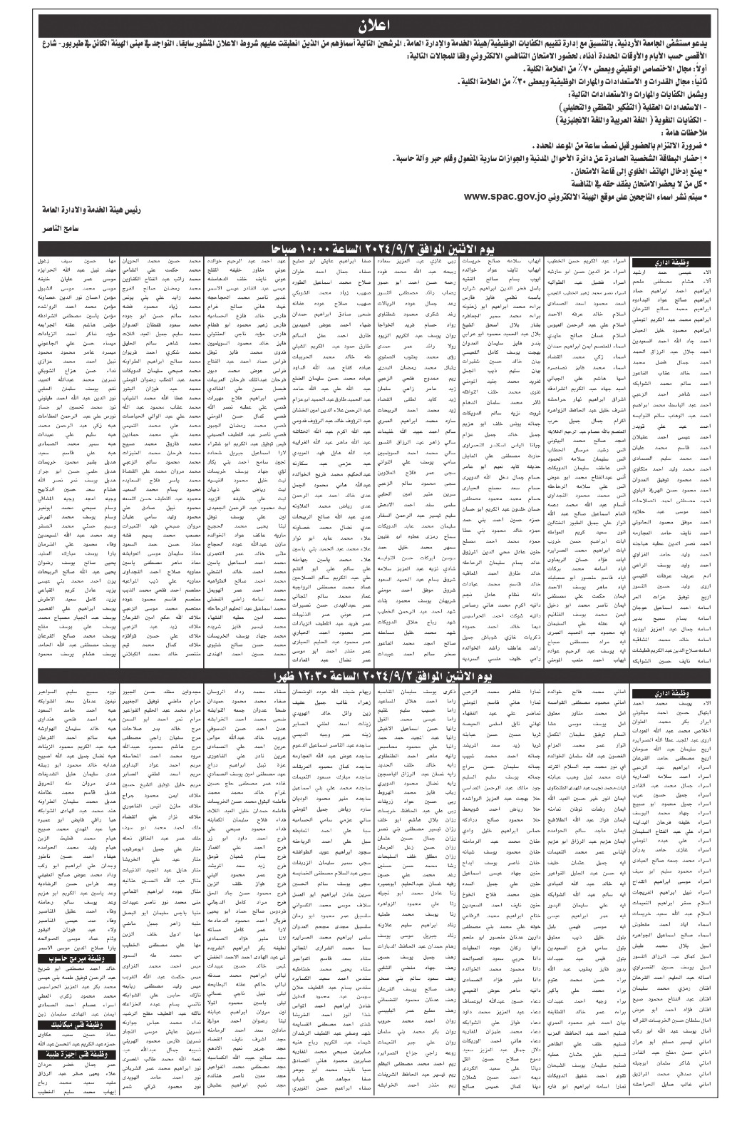 دعا مستشفى الجامعة الأردنية بالتنسيق مع إدارة تقييم الكفايات الوظيفية/هيئة الخدمة والإدارة العامة، المرشحين التالية أسماؤهم لحضور الامتحان التنافسي الالكتروني لعدة مجالات، وتالياً الأسماء والتفاصيل: