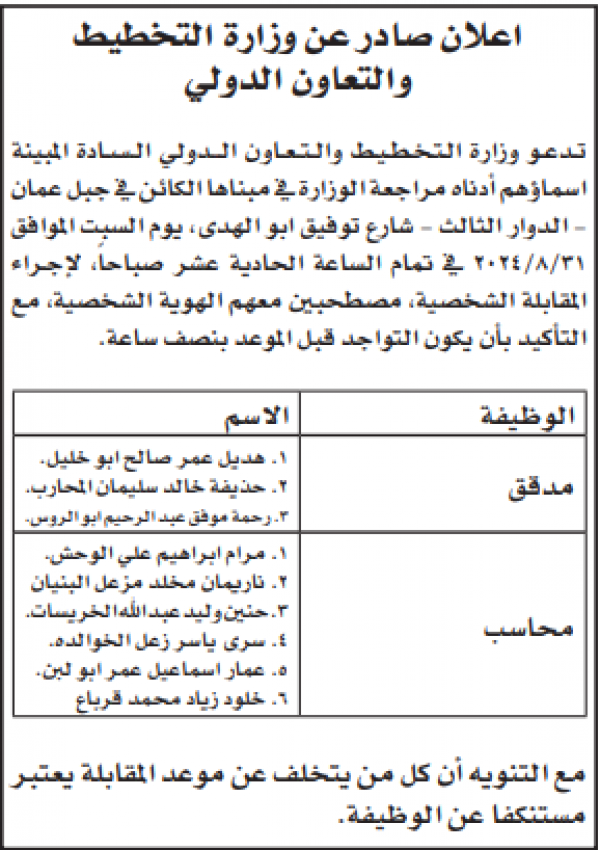 : دعت وزارات ومؤسسات حكومية وبلديات ،اليوم الثلاثاء، التالية اسماؤهم للمقابلات الشخصية لغايات استكمال التعيين.