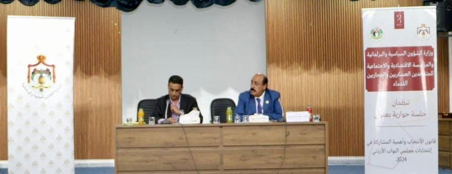 جاء ذلك في ندوة حوارية نظمتها المؤسسة الاقتصادية والاجتماعية للمتقاعدين العسكريين والمحاربين القدماء اليوم الأربعاء بالتعاون مع وزارة الشؤون السياسية والبرلمانية بعنوان (قانون الانتخاب وأهمية المشاركة في انتخابات مجلس النواب الأردني ) في قاعة مجلس إعمار الطفيلة ، شارك فيها مدير عام المؤسسة اللواء الركن المتقاعد الدكتور إسماعيل الشوبكي ومندوب وزارة  الشؤون السياسية معاذ الخالدي  بحضور نخبه كبيرة من المتقاعدين  العسكريين ووجهاء محافظة الطفيلة .