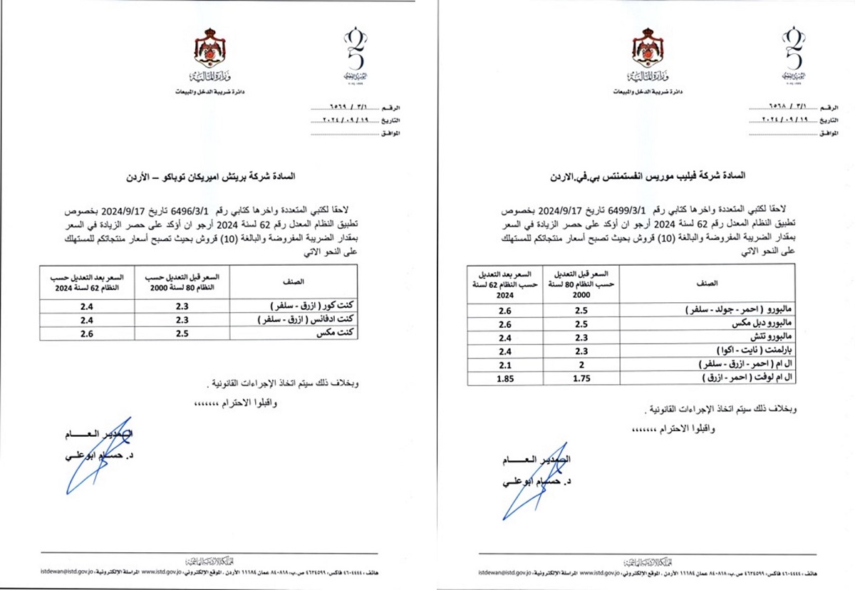 ووجه الدكتور حسام أبو علي مدير عام الدائرة كتبا رسمية لجميع شركات السجائر في المملكة وطلب فيها من هذه الشركات ضرورة التقيد والالتزام بأسعار أنواع السجائر التي تنتجها هذه الشركات وتم ارفاق أسماء وأنواع هذه المنتجات واسعارها قبل التعديل والاسعار المقرر الالتزام بها بعد التعديل.