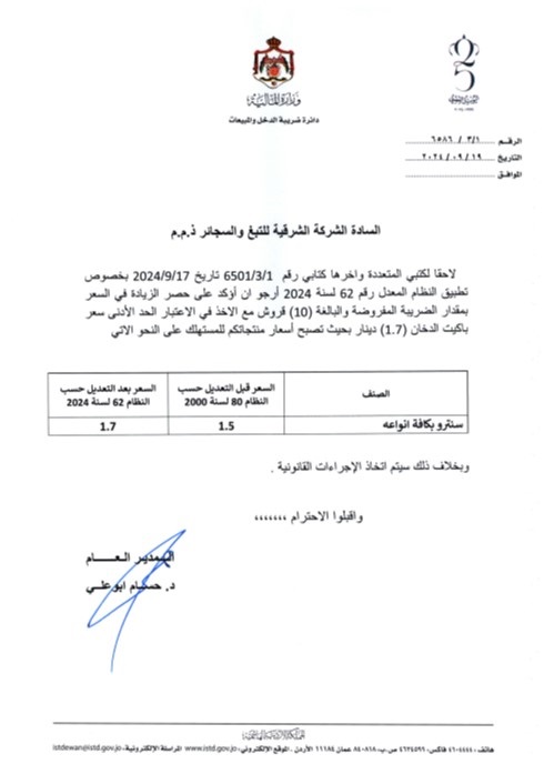 وطلب الشركات والموزعين ضرورة الالتزام التام بعدم تجاوز قيمة هذه الزيادة البالغة 100 فلس لكل علبة سجائر، علما بان الحد الأدنى لسعر علبة السجائر 1700 فلس وكما ورد في النظام رقم 62 لسنة 2024 المعدل لنظام الضريبة الخاصة وذلك بالتقيد بالزيادة التي طرأت على أسعار علب السجائر وهي بواقع 100 فلس لكل علبة سجائر.