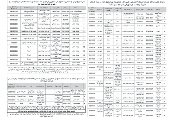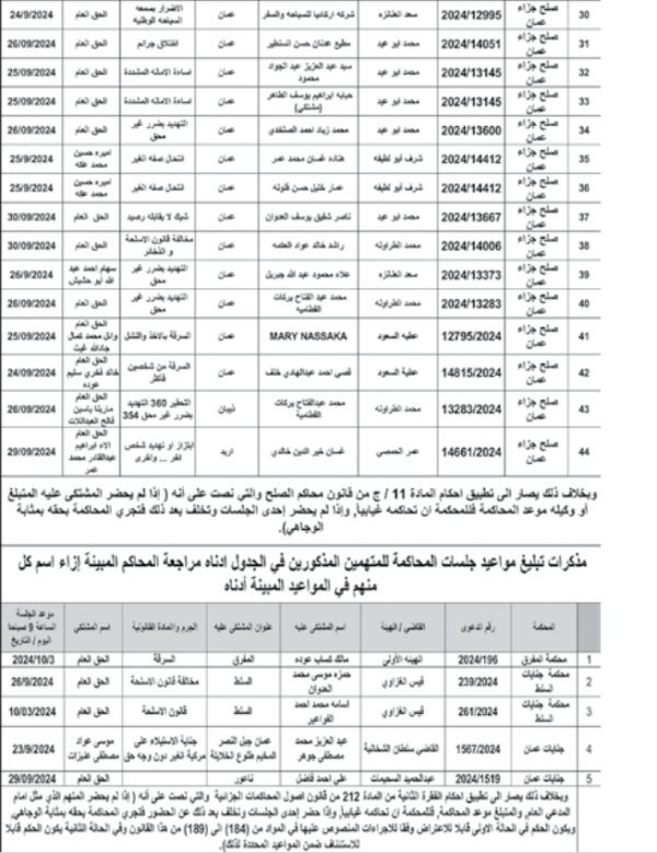 وكما صدرت مذكرات تبليغ اليوم، بمواعيد جلسات المحاكمة لمشتكى عليهم في المحاكم النظامية.