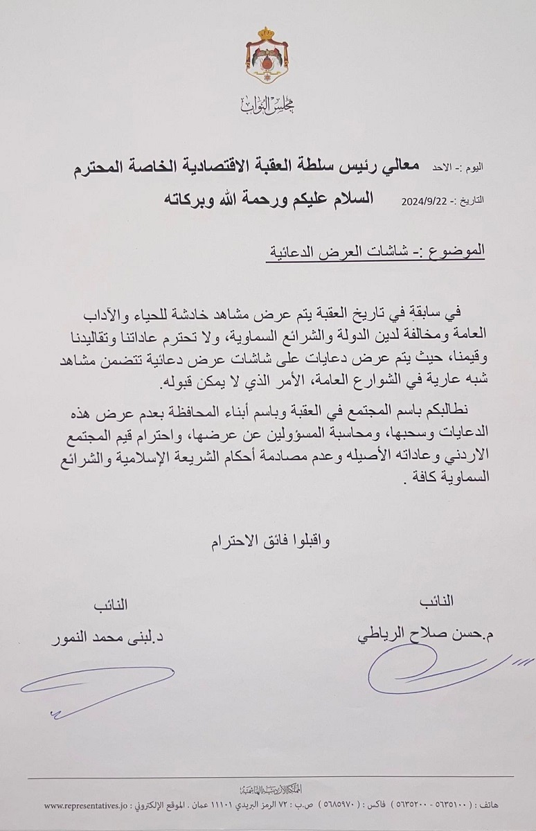 طالب نائبا محافظة العقبة حسن الرياطي ولبنى النمور، رئيس سلطة منطقة العقبة الاقتصادية الخاصة، بعدم عرض الدعايات والمشاهد الخادش للحياء والآداب العامة والمخالفة لدين الدولة والشرائع السماوية، وسحب تلك الاعلانات من الشوارع العامة فورا ومحاسبة المسؤول عن عرضها.
