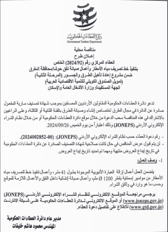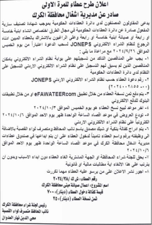كما طرحت مديرية أشغال الكرك عطاء يستهدف المقاولون في الفئة الخامسة والسادة لصيانة مبنى محافظة الكرك .