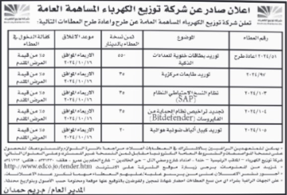 طرحت مؤسسات ووزارات وبلديات والمديريات عدداً من العطاءات لبدء تنفيذها في محافظات المملكة .