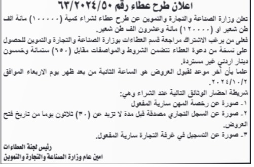 وكانت وزارة الصناعة والتجارة قد طرحت عطاءً لشراء  100 ألف طن من الشعير ، أو 120 ألف طن من الشعير ، علماً بأن آخر موعد لقبول العروض هو 02/10/2024 .