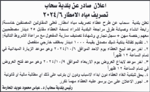 وطرحت بلدية سحاب عطاءً لتصريف مياه الأمطار ، وحددت آخر موعد لبيع العطاء يوم الأحد الموافق 06/10/2024 / كما أن آخر موعد لإيداع العروض سيكون يوم الأربعاء 0910/2024  .