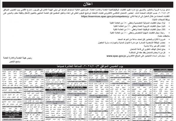 نيروز الإخبارية : أعلنت وزارة التربية والتعليم وبالتنسيق مع إدارة تقييم الكفايات الوظيفية / هيئة الخدمة والإدارة العامة،اليوم الأحد، اسماء دفعة جديدة من المرشحين الذين انطبقت عليهم شروط الاعلان المنشور سابقا ، التواجد في مبنى الهيئة حسب الايام والاوقات المحددة أدناه، لحضور الامتحان التنافسي الالكتروني لغايات الابتعاث لبرنامج الدبلوم العالي في اعداد وتأهيل المعلمين قبل الخدمة المنتهي بالتعيين لاشغال لاوظيفة معلم .