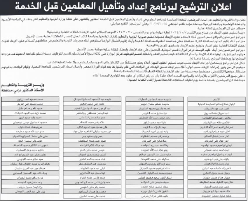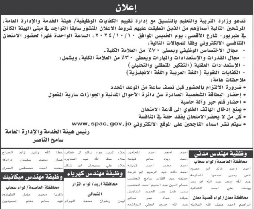 دعت وزارة التربية والتعليم ،اليوم الثلاثاء، عددا من مرشحين لاجراء الامتحان التنافسي.