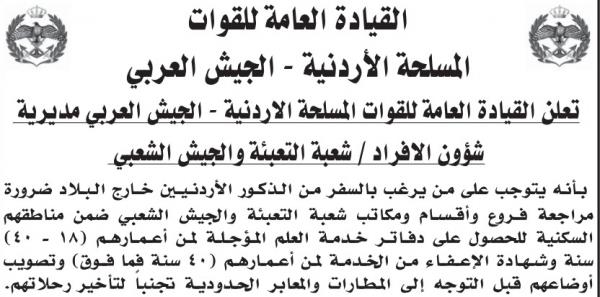 نيروز الإخبارية : أعلنت القيادة العامة للقوات المسلحة الاردنية- الجيش العربي مديرية شؤون الافراد /شعبة التعبئة والتجنيد والجيش الشعبي، بأنه يتوجب على من يرغب بالسفر من الذكور الاردنيين خارج البلاد ضرورة مراجعة فروع وأقسام ومكاتب شعبة التعبئة والجيش الشعبي.