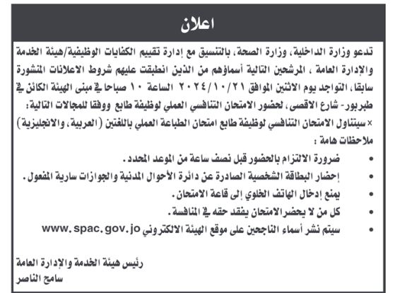 : دعت عدداً من الوزارات والمؤسسات الرسمية بالتنسيق مع هيئة الخدمة الإدارة العامة اليوم الأربعاء، مرشحين لإجراء المقابلات الشخصية واجراء الامتحان التنافسي .