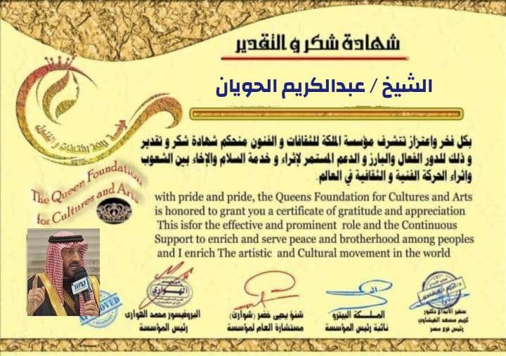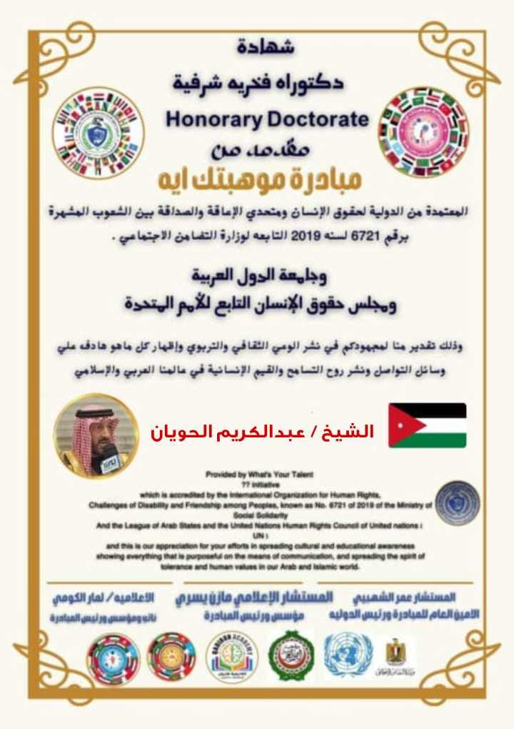 منحت مبادرة "موهبتك"، المعتمدة من الدولية لحقوق الإنسان، الدكتوراه الفخرية الشرفية للشيخ عبدالكريم سلامة الحويان، تقديرًا لإسهاماته البارزة في نشر الوعي الثقافي وتعزيز القيم الإنسانية وإصلاح ذات البين بين الناس.