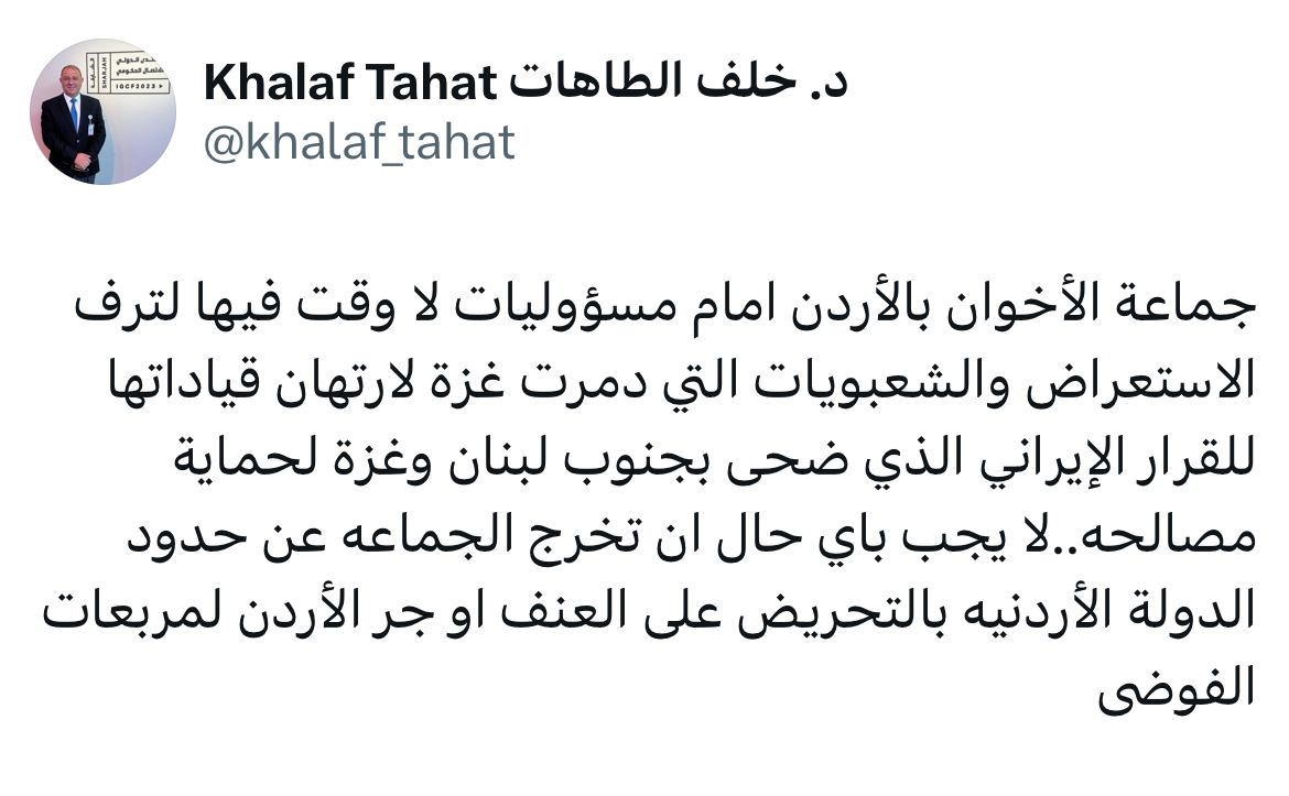 وقال الطاهات في منشور له على منصة إكس اليوم الجمعة "جماعة الإخوان في الأردن أمام مسؤوليات لا وقت فيها لترف الاستعراض والشعبويات التي دمرت غزة لارتهان قياداتها للقرار الإيراني الذي ضحى بجنوب لبنان وغزة لحماية مصالحه. لا يجب بأي حال أن تخرج الجماعة عن حدود الدولة الأردنية بالتحريض على العنف أو جر الأردن لمربعات الفوضى".