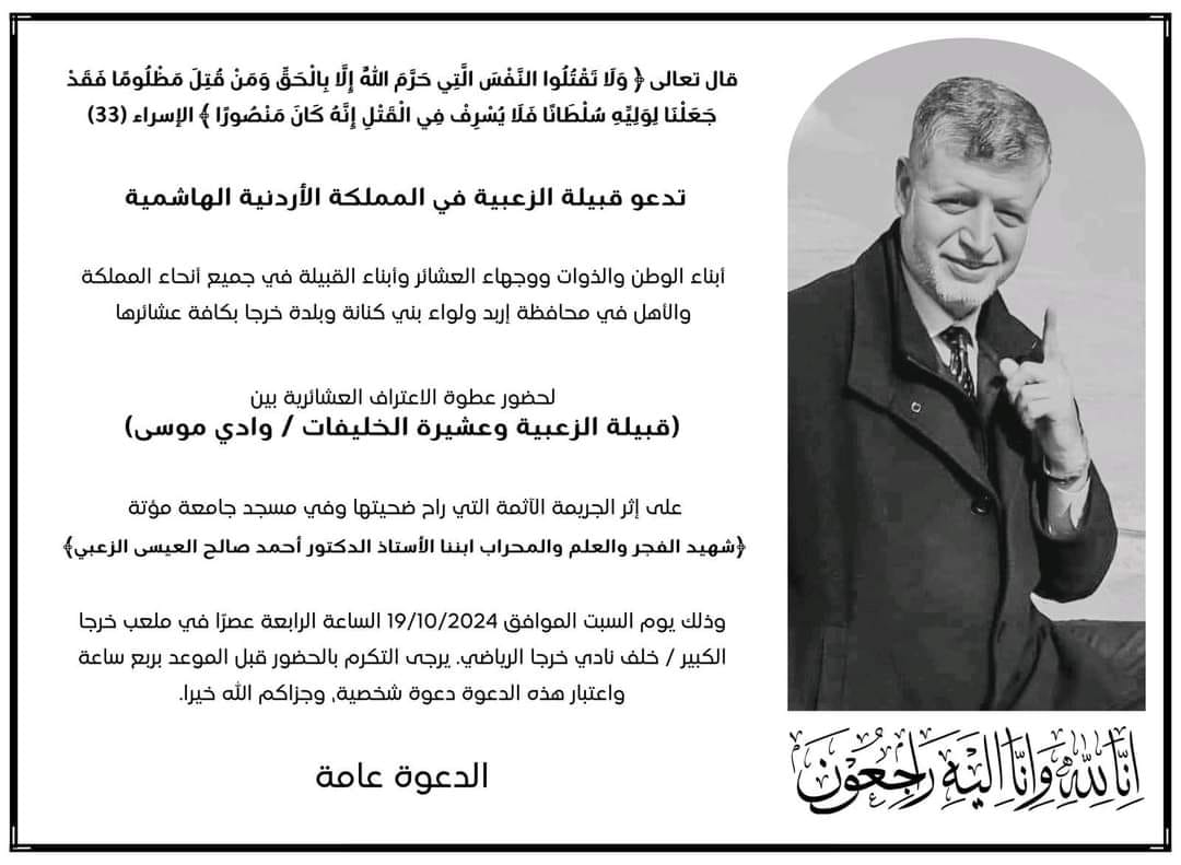 قبيلة الزعبية في المملكة الأردنية الهاشمية وجهة دعوة لكافة أبناء الوطن والذوات ووجهاء العشائر وأبناء القبيلة في جميع أنحاء المملكة والأهل في محافظة إربد ولواء بني كنانة وبلدة خرجا بكافة عشائرها لحضور عطوة الاعتراف العشائرية بين (قبيلة الزعبية وعشيرة الخليفات/ وادي موسى) على إثر الجريمة الآثمة التي راح ضحيتها وفي مسجد جامعة مؤتة، شهيد الفجر والعلم والمحراب الأستاذ الدكتور أحمد صالح العيسى الزعبي.