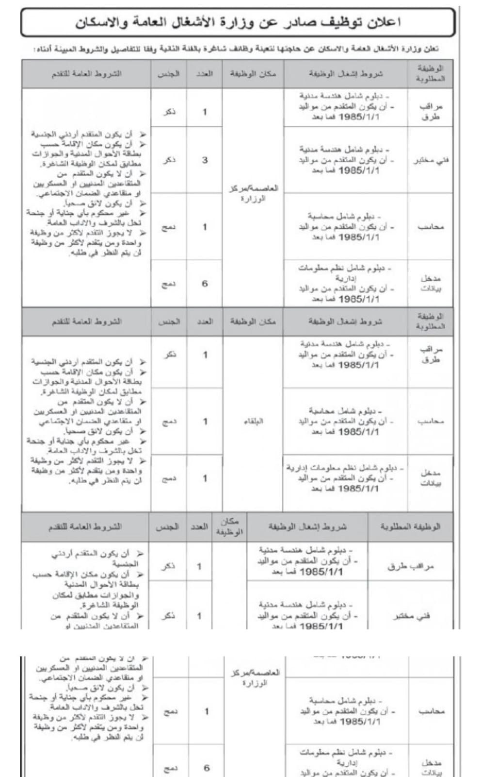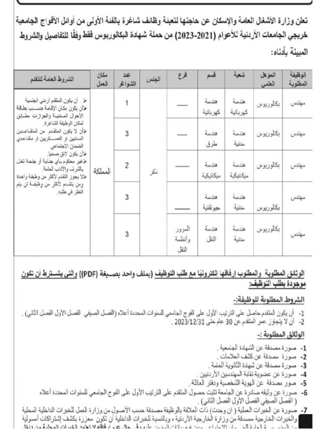 أعلنت وزارة الاشغال العامة والاسكان، اليوم الثلاثاء، عن حاجتها لملء شواغر وظيفية لديها .