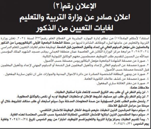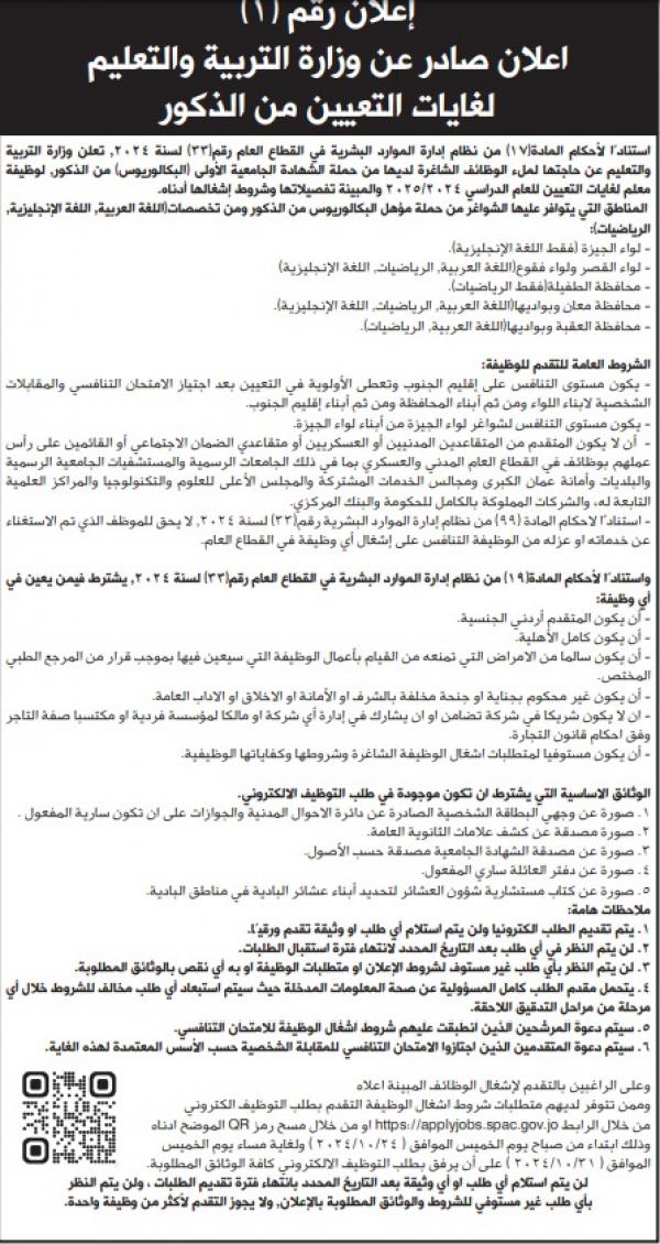 نيروز الإخبارية : أعلنت وزارة التربية والتعليم ، اليوم الاربعاء، عن حاجتها لملء وظائف شاغرة لديها من حملة الشهادة الجامعية الأولى "البكالوريوس" من الذكور .
