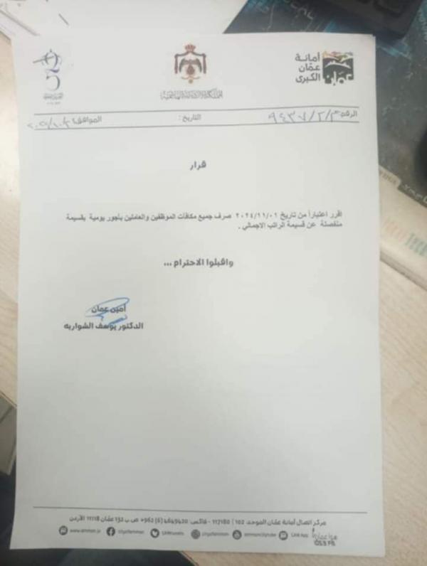 وقال الصبيحي في إدراج له عبر الفيسبوك الخميس: تواصل معي عدد من العاملين في أمانة عمان الكبرى على نظام المياومة وبأجور شهرية، يشتكون من أن الأمين أصدر قراراً يوجّه بموجبه بصرف كآفة المكافآت التي يتقاضونها شهرياً بقسيمة منفصلة عن قسيمة الراتب الشهري.