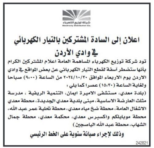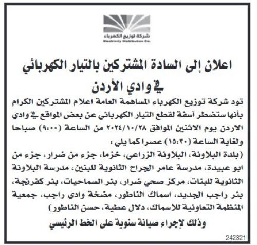 أعلنت شركات الكهرباء عن اضطرارها لفصل التيار الكهربائي الاسبوع المقبل عن مناطق واسعة في العديد من المحافظات كالكرك والطفيلة واربد وجرش وعجلون والشونة والأغوار الشمالية ووادي الأردن لغايات الصيانة.