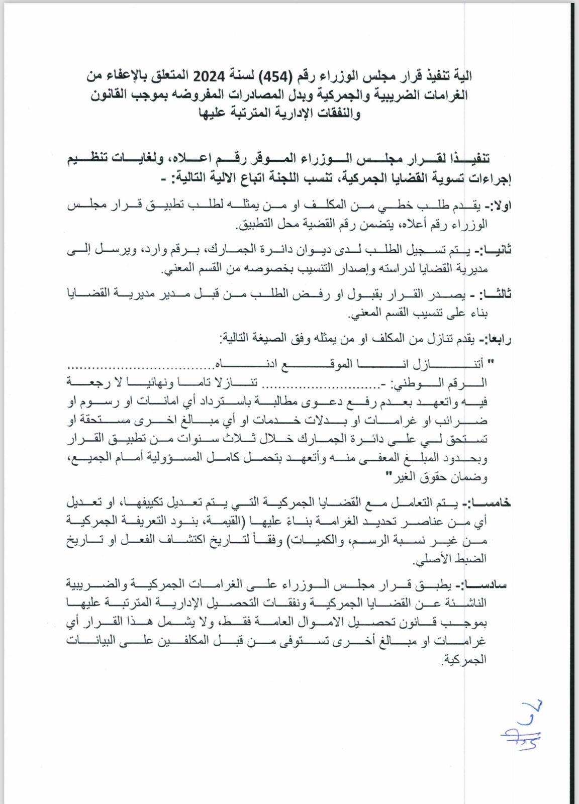 كشفت الجمارك الاردنية اليوم الاحد، آلية تنفيذ قرار مجلس الوزراء رقم (454) لسنة 2024 المتعلق بالإعفاء من الغرامات الضريبية والجمركية وبدل المصادرات المفروضه بموجب القانون والنفقات الإدارية المترتبة عليها .