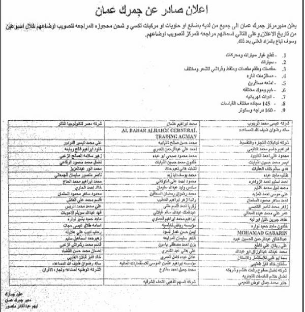جمرك عمان يدعو مخالفين لتصويب أوضاعهم (أسماء)
