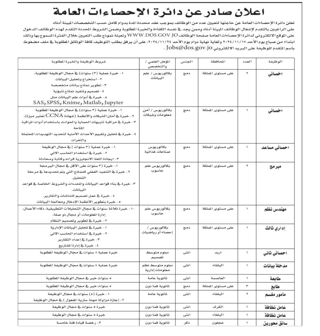 أعلنت دائرة الإحصاءات العامة عن حاجتها لشغل العديد من الوظائف من حاملي درجة البكالوريوس والدبلوم والثانوية العامة فما دون.