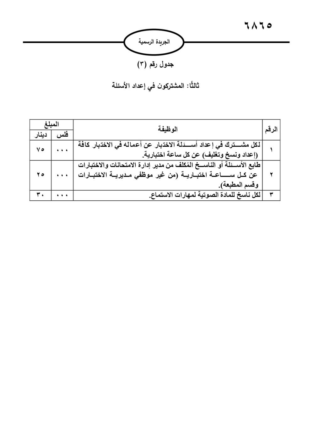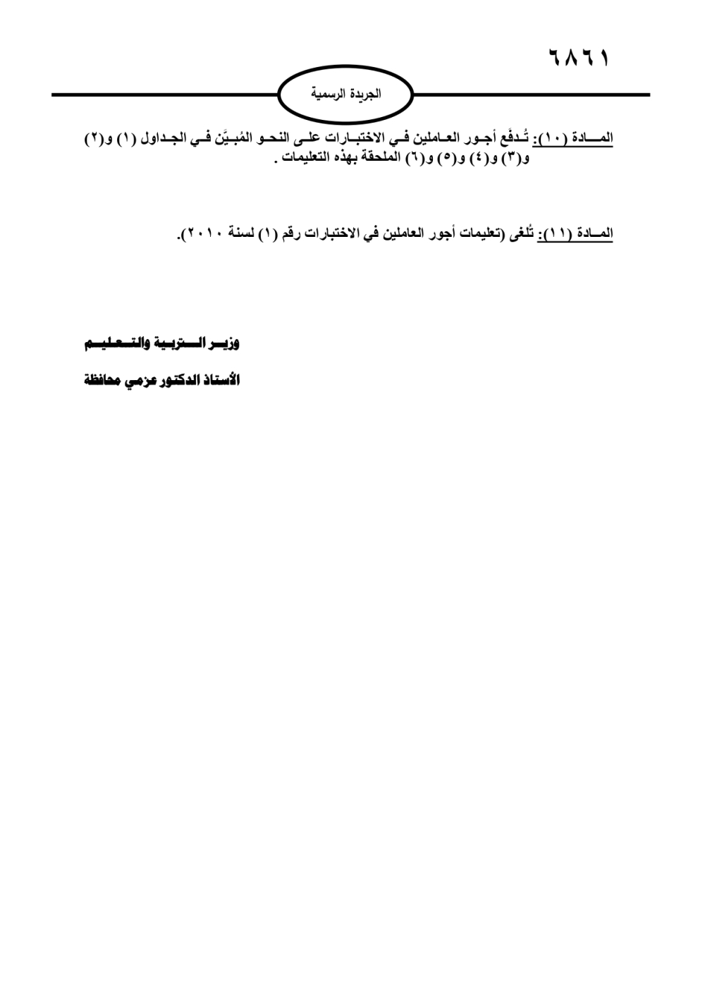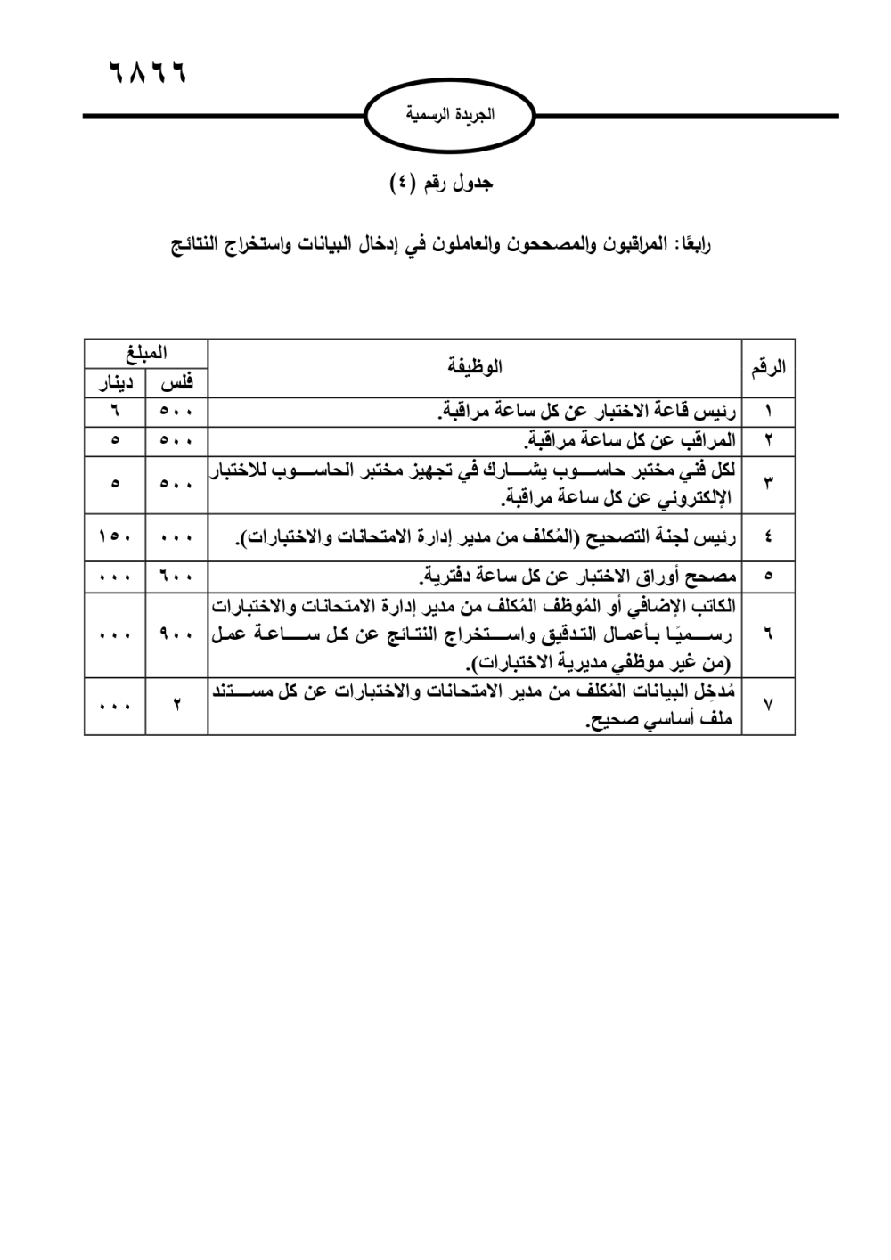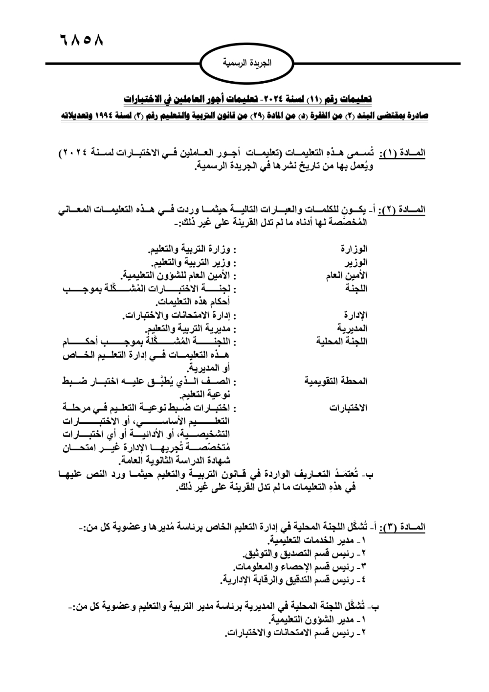 صدر في الجريدة الرسمية، الأحد، تعليمات أجور العاملين في الاختبارات رقم (11) لسنة 2024. وتاليا نص التعليمات: