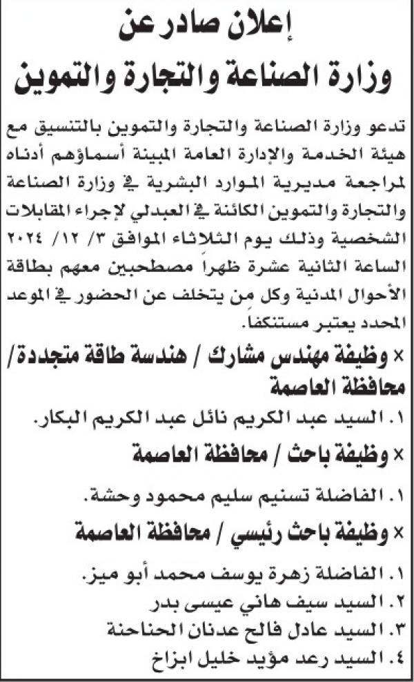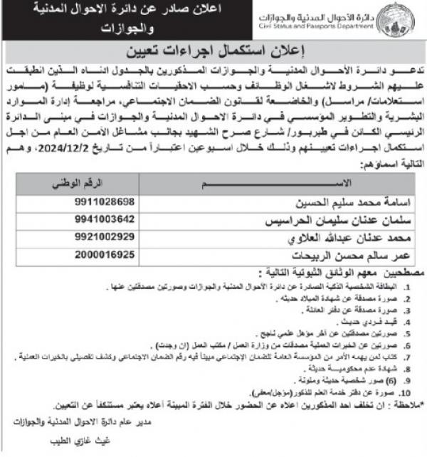 : دعت وزارات ومؤسسات حكومية ،الاثنين، المرشحين التالية اسماؤهم الى الحضور لغاية استكمال اجراءات التعيين، وكما أعلنت مؤسسات أخرى عن توفر شواغر لديها.