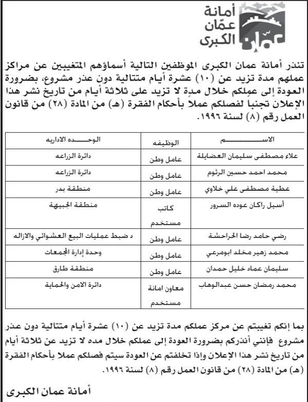 وعت الأمانة المذكورين أدناه الى ضرورة العودة إلى عملهم خلال مدة لا تزيد عن 3 أيام من تاريخ نشر هذا الإعلان، وإلا سيتم فصلهم.