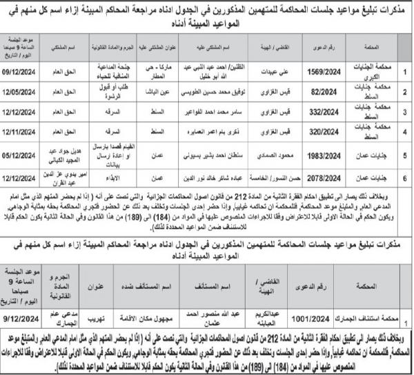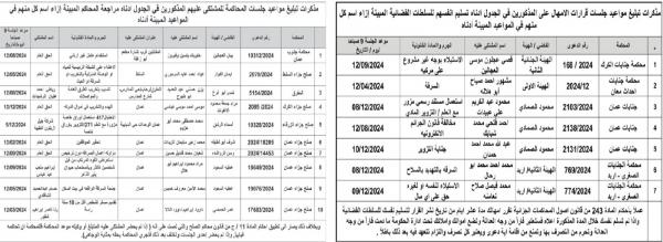 وطلبت المذكرات من المذكورين في الجداول أدناه مراجعة المحاكم المبينة ازاء اسم كل منهم في المواعيد المبينة أدناه.