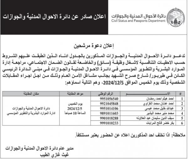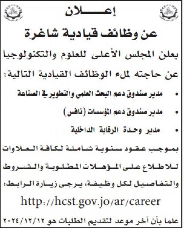 : أعلن المجلس الأعلى للعلوم والتكنولوجيا عن حاجته لملء وظائف قيادية متوفرة، وكما دعت عدد من المؤسسات الحكومية مرشحين لغايات استكمال إجراءات التعيين والخضوع للفحص الفني.