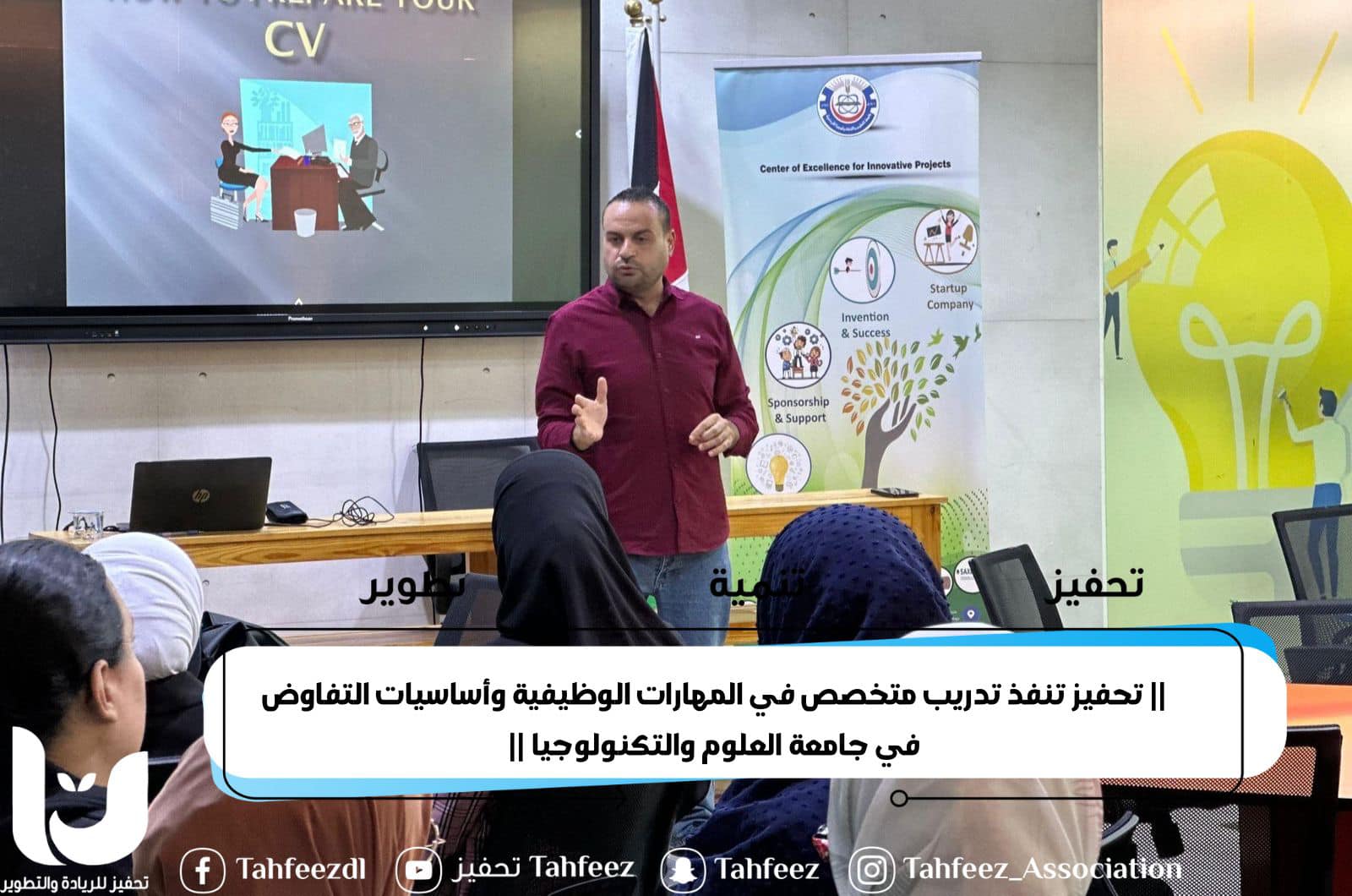 وكذلك نفذت جمعية تحفيز للريادة والتطوير تدريب المهارات الوظيفية وأساسيات التفاوض بالتعاون مع جامعة العلوم والتكنولوجيا الأردنية وجامعة كيمنتس الألمانية للتكنولوجيا، لطلبة قسم الهندسة الطبية الحيوية في جامعة العلوم، بهدف بناء مهاراتهم بشكل فعال وتعزيز مشاركتهم المجتمعية وتأهيلهم لسوق العمل. تضمن التدريب مجموعة من المحاور التي تركزت على توضيح المهارات الوظيفية وربطها بسوق العمل. كما تم تزويد المشاركين بالمعلومات الأساسية المتعلقة بسوق العمل، مثل كيفية إعداد وتصميم السيرة الذاتية، كتابة الخطاب التحفيزي، والاستعداد لمقابلات العمل ومهارات التفاوض وحل المشكلات. واختتمت جمعية تحفيز للريادة والتطوير معسكر تمكين الشباب في تنفيذ المشاريع الإنتاجية الصغيرة والصناعات الابداعية، والذي نفذته مديرية المبادرات والعمل التطوعي في وزارة الشباب بالتعاون مع جمعية تحفيز في بيت شباب محافظة اربد بمشاركة 40 شاب من محافظات الشمال والوسط. وجاء المعسكر بهدف تعزيز قدرات الشباب في في مجال ريادة الأعمال وتأسيس المشاريع الإنتاجية الصغيرة، وتطوير مهاراتهم الإدارية والمالية بما يحقق الريادة والتمكين الاقتصادي. وتضمن المعسكر الذي جاء على مدار ثلاثة أيام متتالية محاور عدة تهدف إلى دراسة المشروع وكتابة خطة عمل وإجراء الدراسات المالية، بالإضافة إلى كيفية عرض المنتجات وتسويقها من خلال مواقع التواصل الإجتماعي وربطها باحتياجات المجتمع المحلي.  وخلال المعسكر تم زيارة سوق تحفيز وهو مساحة مستدامة تعمل على عرض وتسويق منتجات المشاريع الصغيرة والمنزلية بهدف تعريف المشاركين بهذه المساحة الريادية التي تساهم في توفير فرص عمل مستدامة.