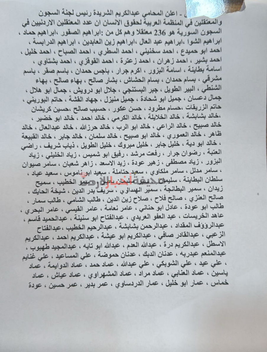 طالبت المنظمة العربية لحقوق الإنسان وزارة الخارجية وشؤون المغتربين الاردنية بمتابعة ملف المعتقلين الأردنيين في سوريا. وأكدت المنظمة أن المعلومات المتوفرة لديها تقول إن عدد الأردنيين في السجون السورية 236 معتقلا، غالبيتهم نزلاء في سجن صيدنايا وكانوا في عداد المفقودين.