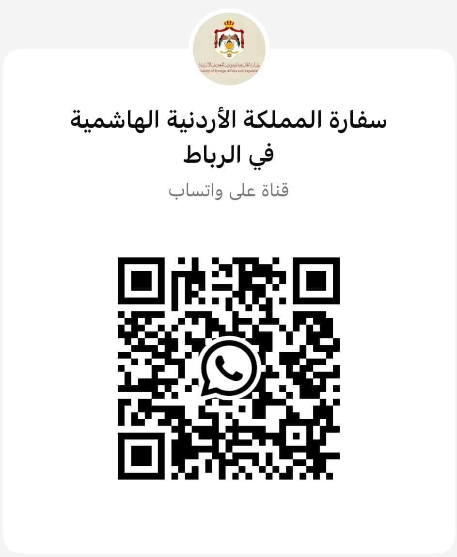 أعلنت سفارة المملكة الأردنية الهاشمية في الرباط عن إطلاق قناة رسمية على تطبيق واتساب، بهدف تسهيل التواصل مع أبناء الجالية الأردنية في المملكة المغربية وتعزيز التعاون والتنسيق معهم. تهدف القناة إلى متابعة شؤون الجالية وتقديم الخدمات اللازمة بشكل أسرع وأكثر كفاءة. تدعو السفارة جميع الراغبين في الاشتراك بالقناة إلى إجراء مسح للرمز (QR) المرفق او عن طريق الرابط التالي والانضمام للاستفادة من الخدمات والمعلومات التي ستقدمها القناة.