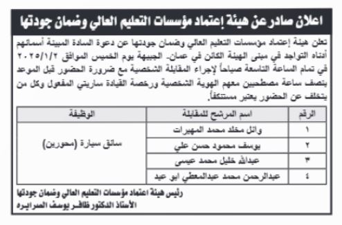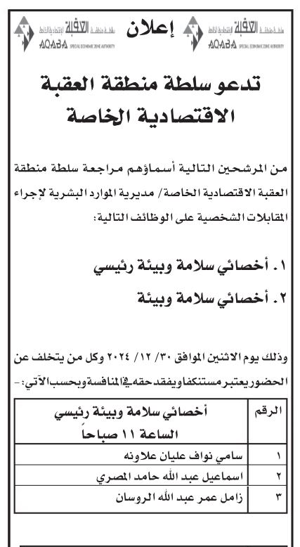 دعت سلطة منطقة العقبة الاقتصادية الخاصة، وهيئة اعتماد مؤسسات التعليم العالي وضمان جودتها، عددا من المرشحين، لإجراء مقابلات شخصية، بهدف التعيين.