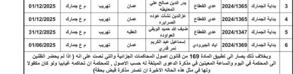 : صدرت مذكرات تبليغ اليوم الاثنين، بمواعيد جلسات المحاكمة لمشتكى عليهم في المحاكم النظامية.