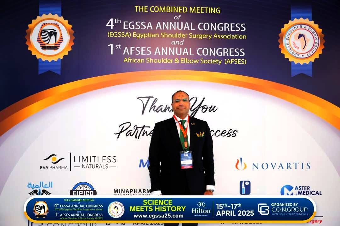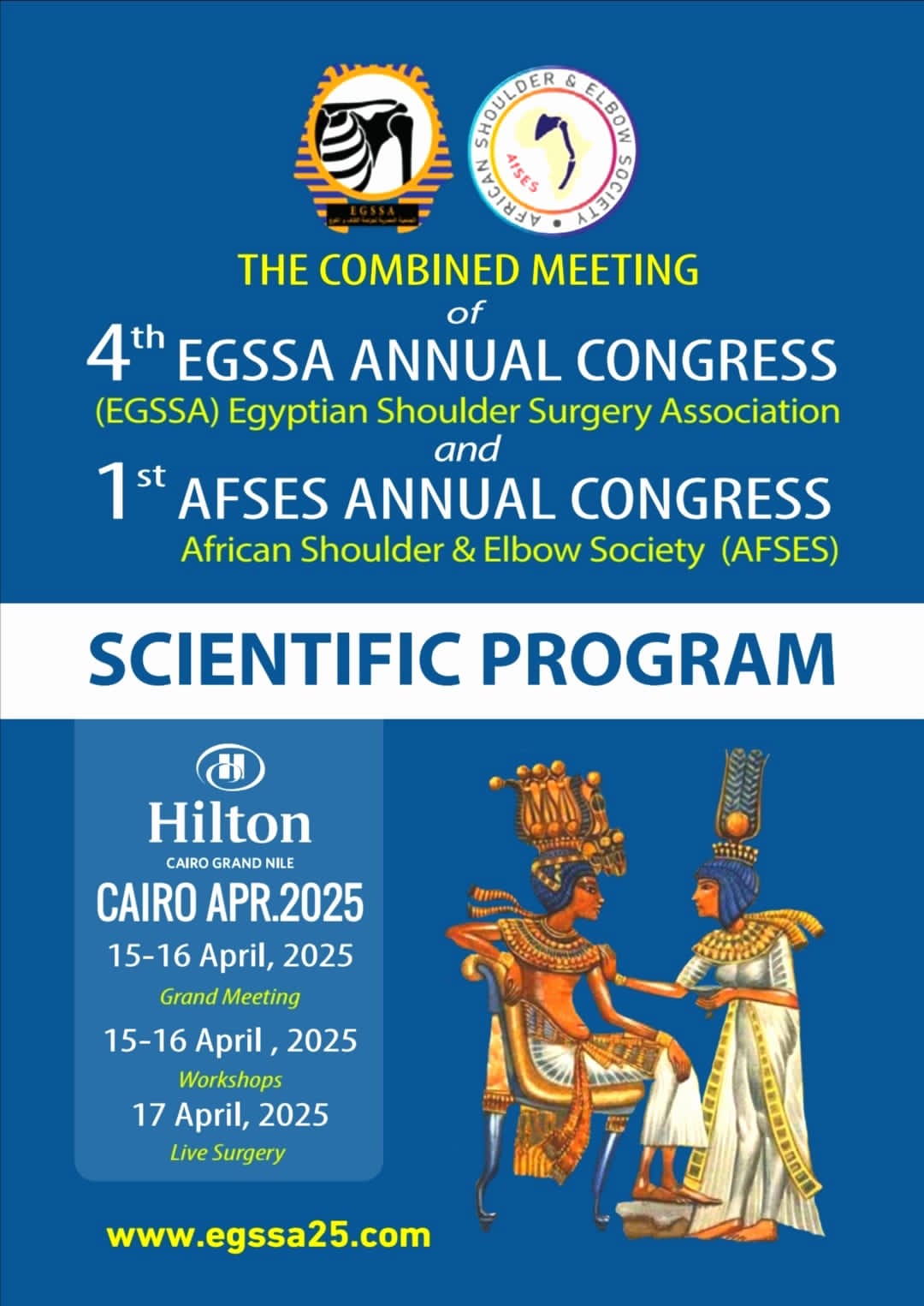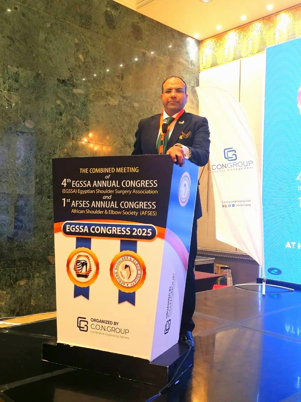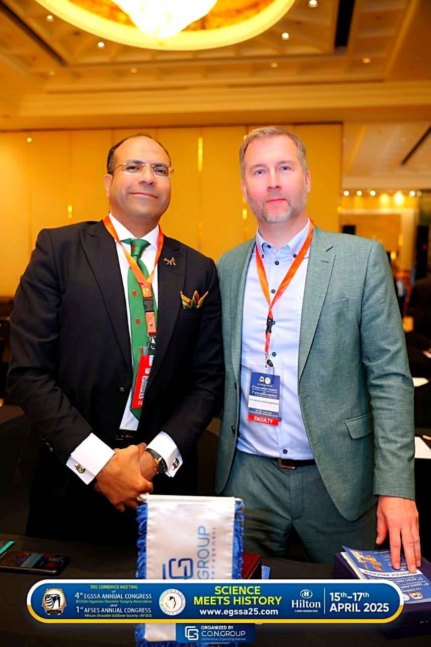 وتستمر السيمفونية العلمية الدولية عزفا بعطاء علمي زاخر للأنشطة السنوية ومؤتمرات فريق الجمعية المصرية لجراحة الكتف المصرية (EGSSA) برئاسة البروفيسور والعالم الجليل / ياسر صافوري prof.dr.Yaser Safory استاذ جراحات العظام و رئيس قسم العظام في مستشفى جامعة قصر العيني، و بمشاركة فاعلة وتعاون مع الجمعية الأفريقية لجراحة الكتف والمرفق ((AFSES برئاسة الجراح العالمي والبروفيسور الألماني / باسم فليجا Prof.Basim Flega الرئيس الفخري للجمعية حيث انطلقت فعاليات المؤتمر من يوم الثلاثاء الموافق 15/4/2025 واستمر زهاء ثلاثة ايام وحتى يوم الخميس 17/4/2025م بنجاح باهر وتوفيق بحمد الله.