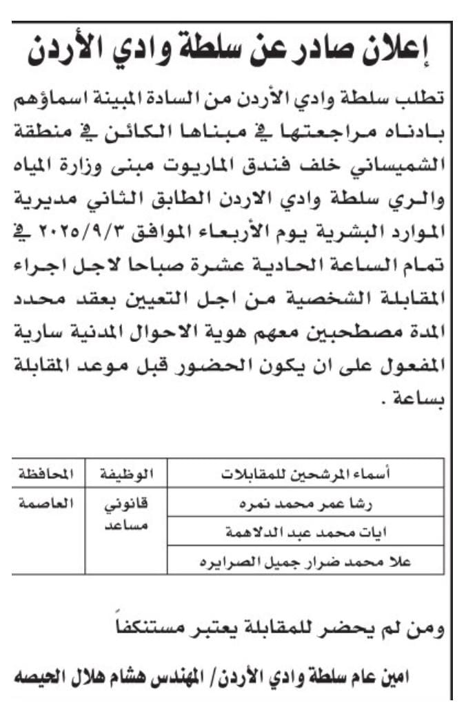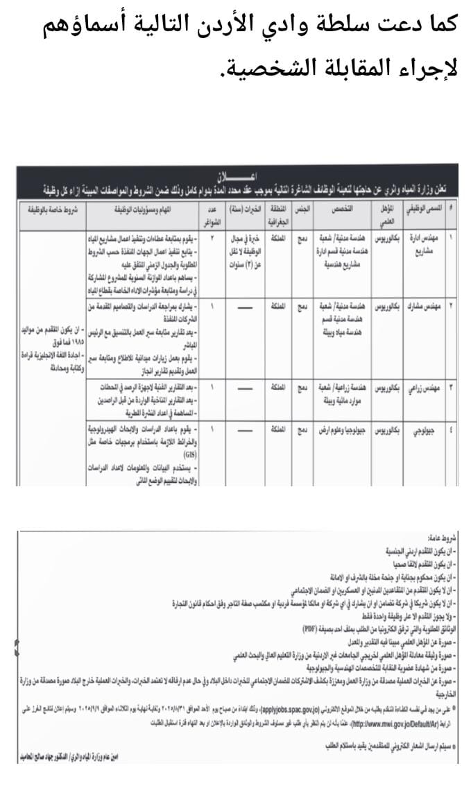 كما دعت سلطة وادي الأردن التالية أسماؤهم لإجراء المقابلة الشخصية.