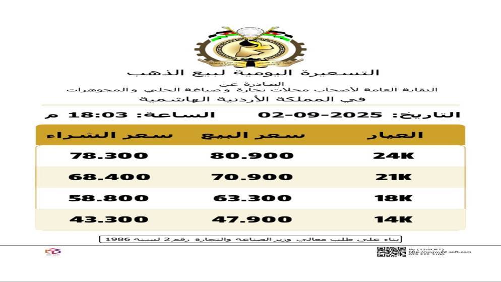 وبلغ سعر بيع الغرام الواحد من الذهب عيارات 24 و18 و14 لغايات الشراء من محلات الصاغة، عند 80.90 و63.30 و47.90 دينارا على التوالي.