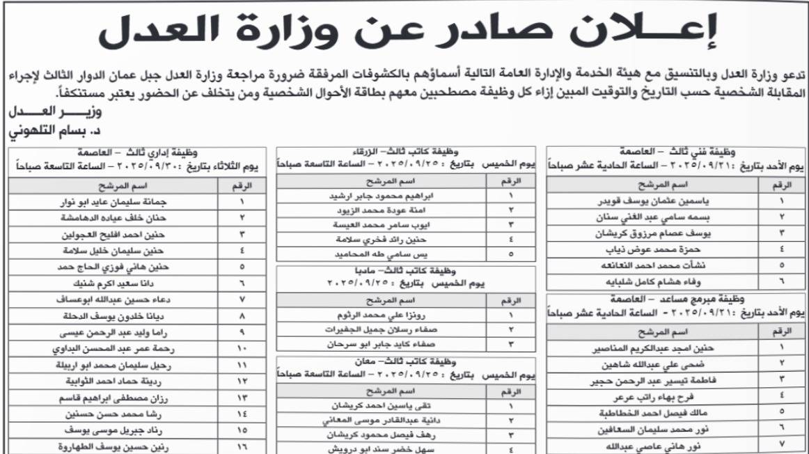 دعت وزارة العدل اليوم الاربعاء التالية اسماؤهم لإجراء المقابلة الشخصية :