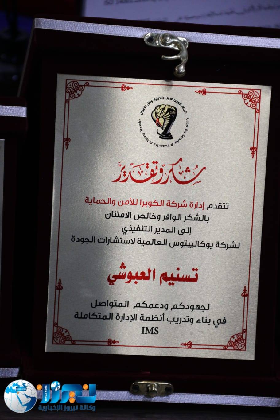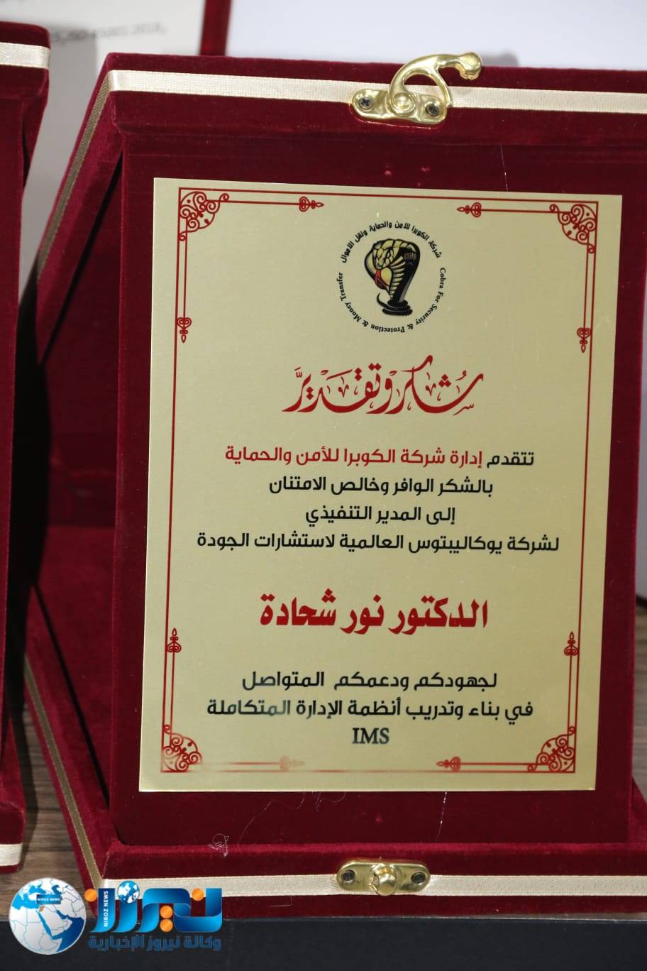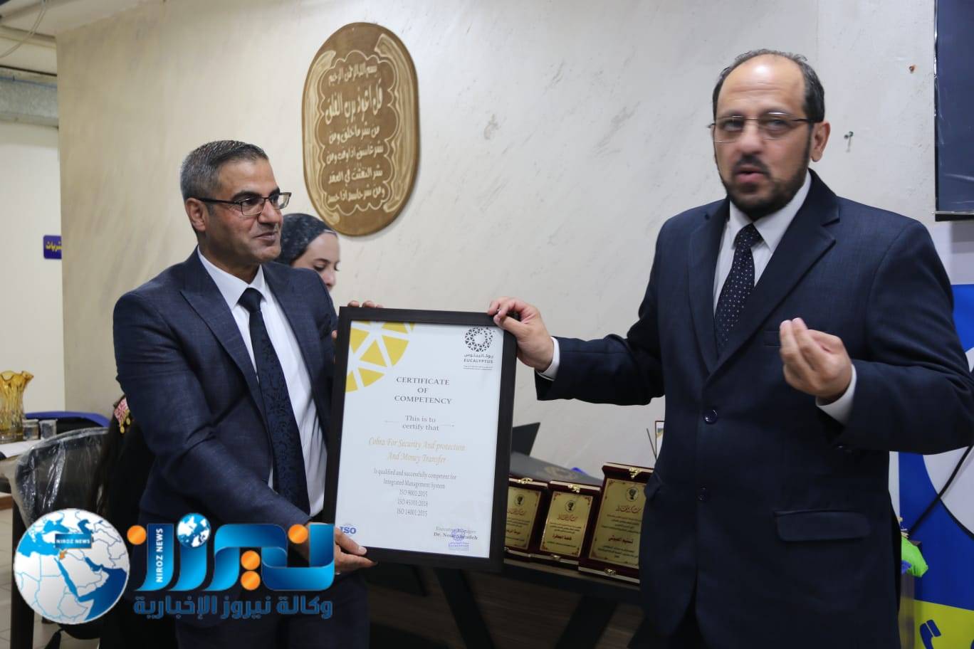 تحت رعاية الرئيس التنفيذي لشركة يوكاليبتوس العالمية لاستشارات الجودة، د. نور شحادة، أقامت شركة الكوبرا للأمن والحماية حفلاً رسمياً بمناسبة حصولها على شهادات الأيزو 9001 (نظام إدارة الجودة)، و45001 (نظام إدارة السلامة والصحة المهنية)، و14001 (نظام إدارة البيئة)، بحضور نخبة من الضيوف وكبار المسؤولين وعملاء الشركة.