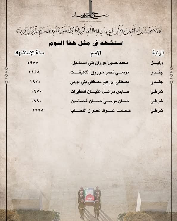 يظل صرح الشهيد شاهدًا خالدًا على عظمة التضحيات التي قدمها أبناء الأردن، الذين ارتقوا دفاعًا عن الوطن وحماية لترابه الطهور.  هذا الصرح ليس مجرد بناء حجري، بل هو رمز للعزة والكرامة، وذاكرة وطنية تحفظ أسماء الرجال الذين رووا الأرض بدمائهم الزكية. في رحاب صرح الشهيد، تلتقي الأجيال لتقرأ على جدرانه حكايات المجد، وتستذكر أسماء أبطالٍ عاشوا أوفياء ومضوا شهداء، لتبقى ذكراهم حيّة في قلب الوطن.  فهم الأحياء عند ربهم يُرزقون، وهم حماة الديار الذين سطروا بأرواحهم ملحمة الفداء. وقد ارتقى في سبيل الله والوطن شهداء من مختلف الرتب والميادين، ليجسدوا معنى الانتماء الصادق والولاء الراسخ، ومنهم: