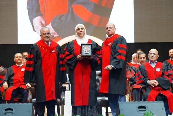 * ثم قام راعي الحفل الدكتور ماهر الحوراني والى جانبه رئيس الجامعة بتكريم نخبة من الاساتذة والباحثين المتميزين ، حيث قدمهم عميد شؤون الطلبة بالقول :