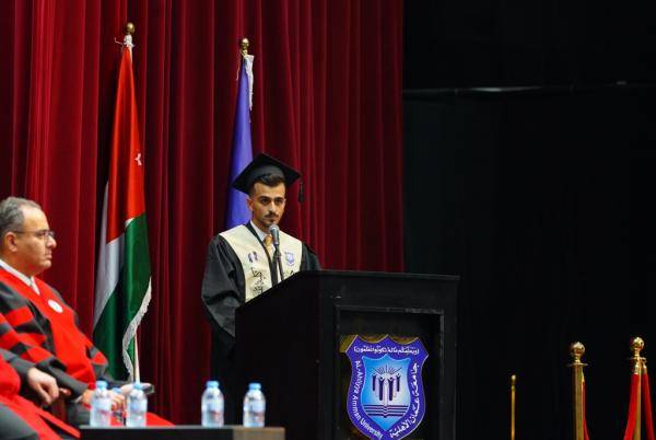 •وألقى كلمة الخريجين والخريجات الطالبة الخريجة نور المناصرة / كلية الصيدلة ، رحبت فيها براعي الحفل ورئيس الجامعة والعُمَدَاءُ،وأعْضَاءُ الهَيْئَتَيْنِ التَّدْرِيسِيَّةِ وَالإِدَارِيَّةِ، وبأهالي الخريجين وذويهم .