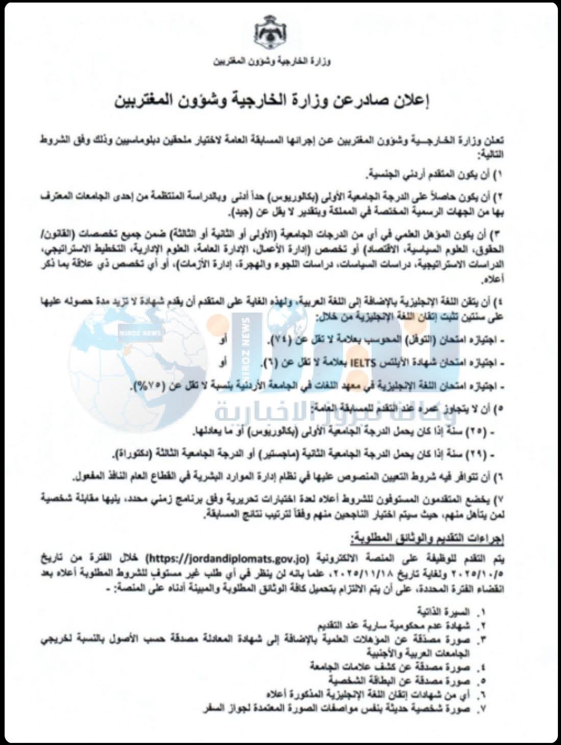 نيروز الإخبارية : أعلنت وزارة الخارجية وشؤون المغتربين عن إجرائها المسابقة العامة لاختيار ملحقين دبلوماسيين، وفقًا لعدة شروط أبرزها أن يكون المتقدم أردنيَّ الجنسية، وأن يكون حاصلًا على الدرجة الجامعية الأولى (بكالوريوس) حدًّا أدنى والدراسة المنتظمة من إحدى الجامعات المعترف بها من الجهات الرسمية المختصة بالمملكة وبتقدير لا يقل عن (جيد).