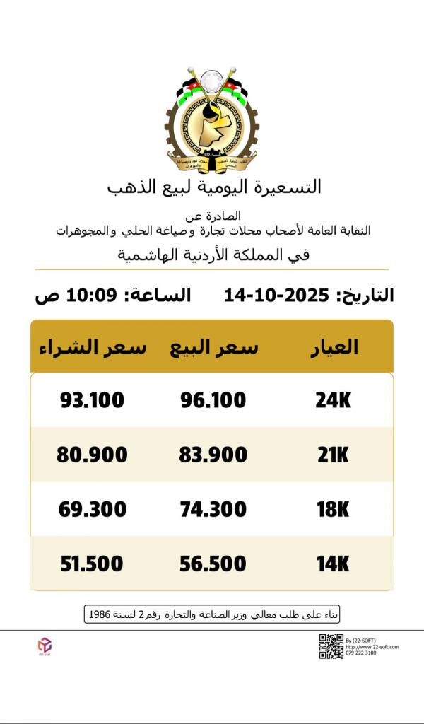 ووفقا للنشرة اليومية الصادرة عن النقابة العامة لأصحاب محلات تجارة وصياغة الحلي والمجوهرات، ارتفع سعر الغرام الواحد من الذهب لعيارات 24 و18 و14 إلى 96.10 دينارا و74.30 دينارا و56.50 دينارا على التوالي، لغايات البيع من محلات الصياغة.