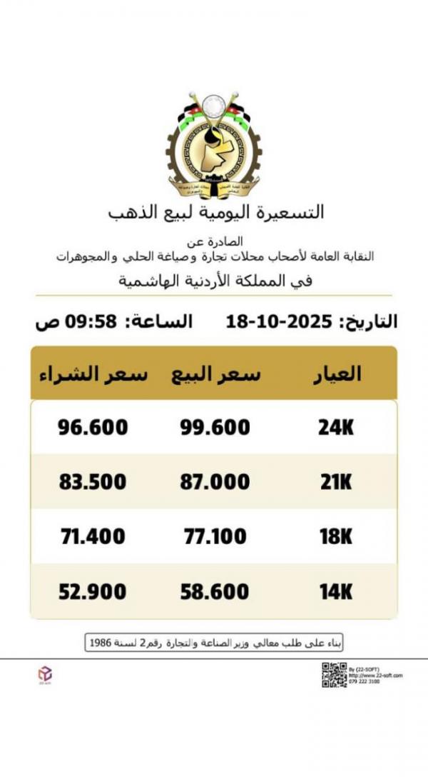 فيما سعر الغرام الواحد من الذهب لعيارات 24 و18 و14 إلى 99.60 دينارا 77.10 دينارا 58.60 دينارا على التوالي، لغايات البيع من محلات الصياغة.