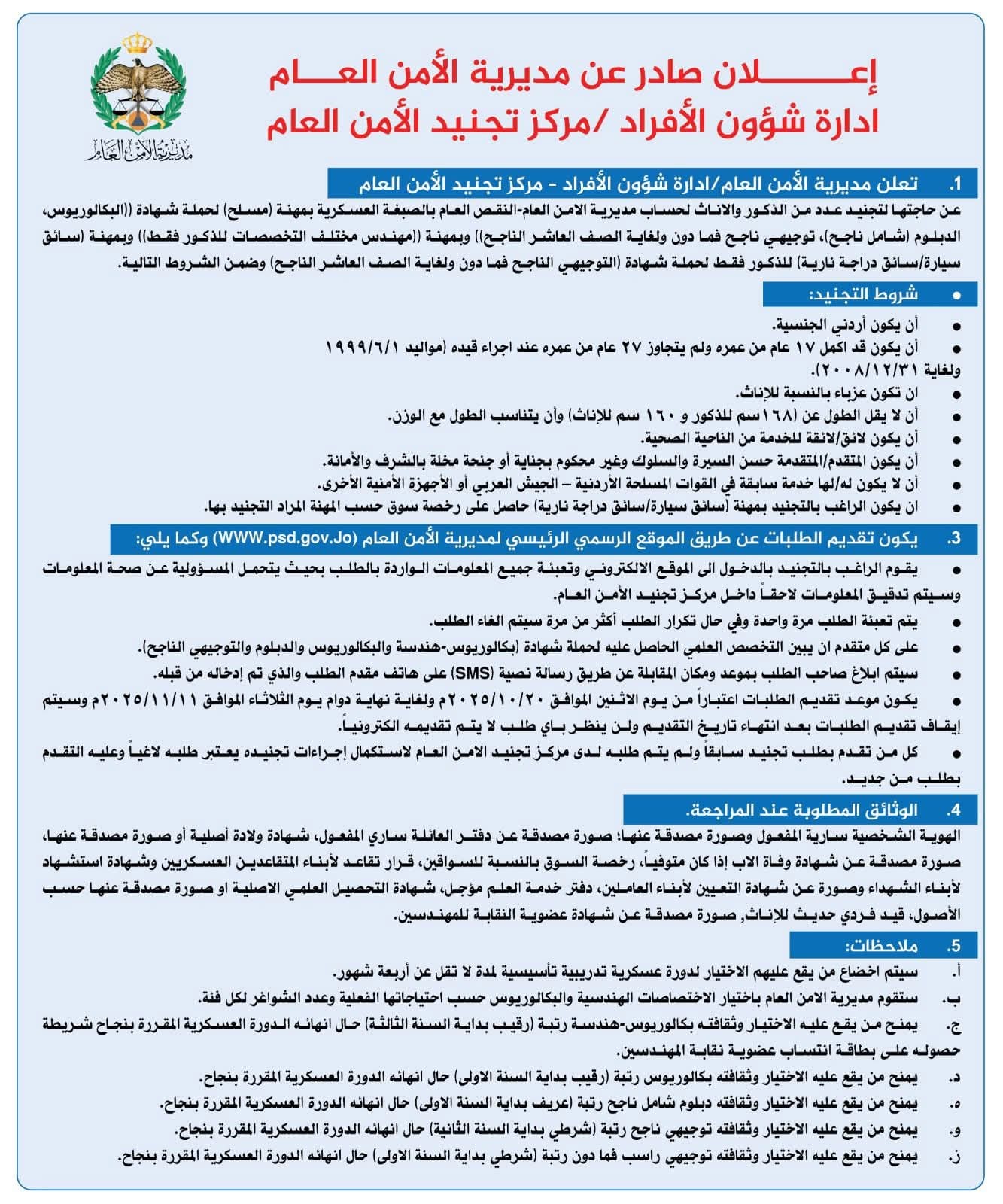 وتالياً نص الإعلان الصادر عن مديرية الأمن العام والذي يتضمن كافة المعلومات والشروط والوثائق المطلوبة: