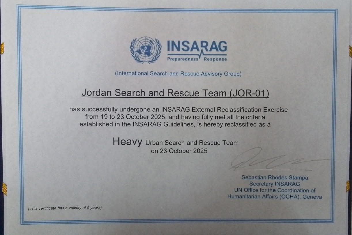 ويُعد فريق البحث والإنقاذ الأردني أول فريق عربي يحصل على التصنيف "الثقيل” منذ عام 2013، واستمر في الحفاظ عليه بفضل الاحتراف المستمر في التدريب، وتطوير القدرات البشرية والتقنية، والالتزام بالمعايير الدولية الخاصة بفرق الطوارئ والإنقاذ.