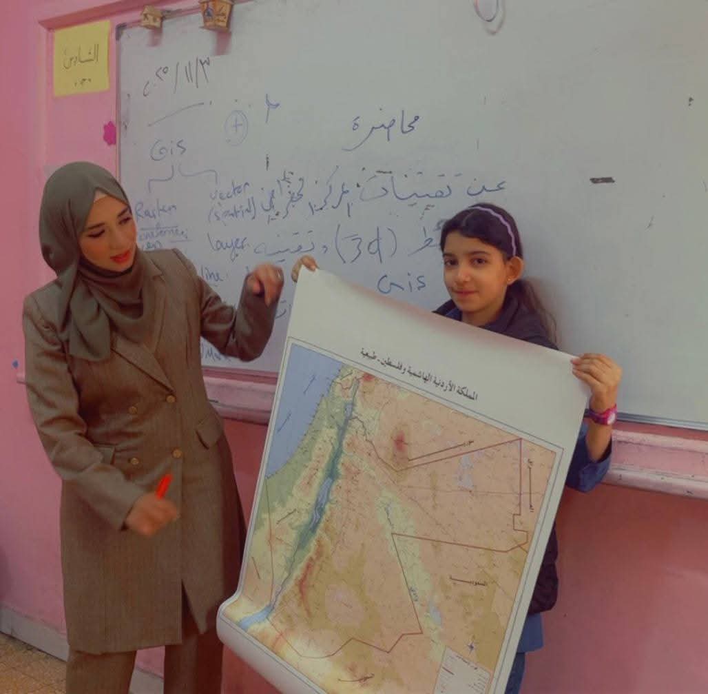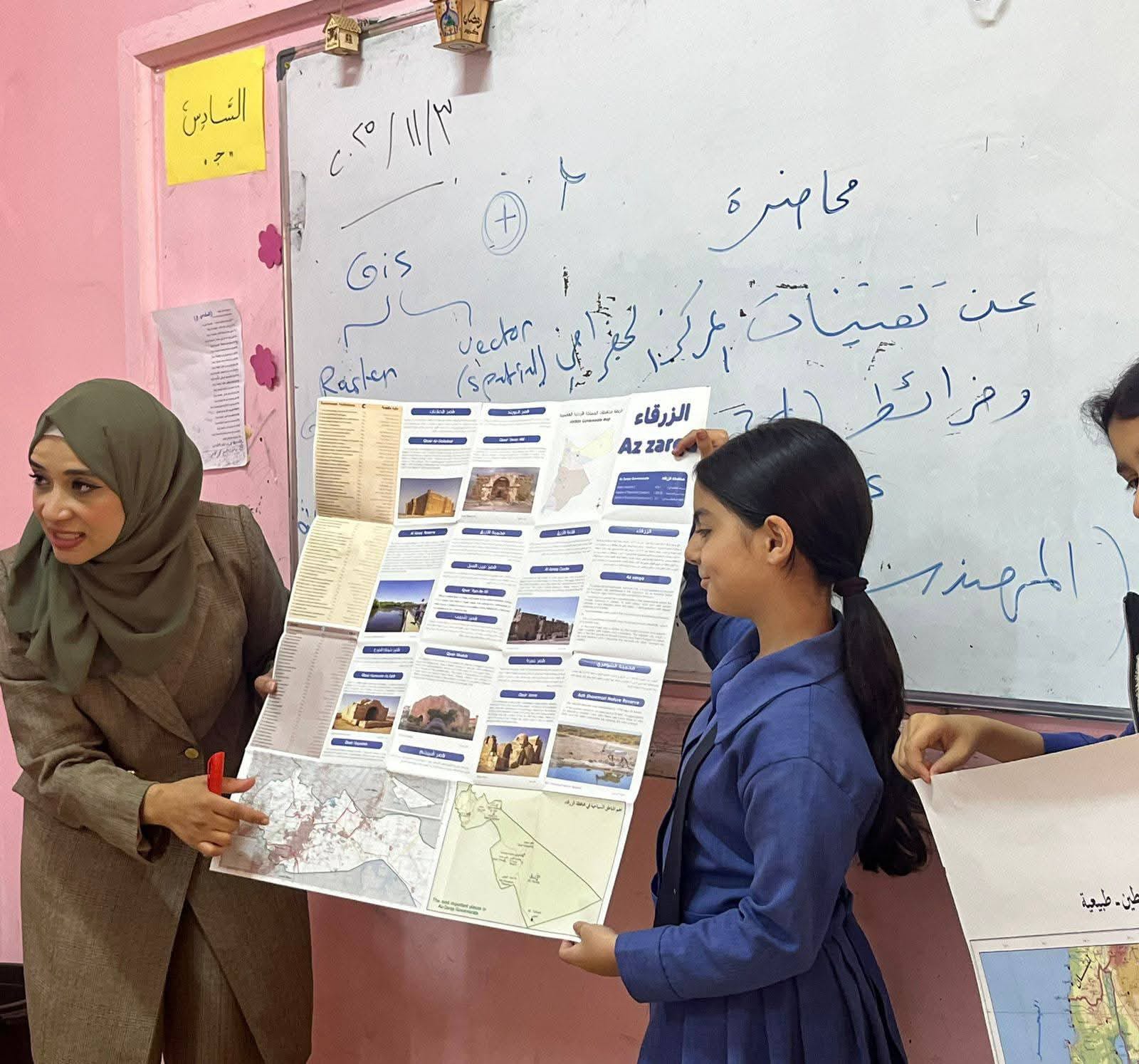 المهندسة هناء الحويطات من المركز الجغرافي الملكي الأردني تحاضر في مدرسة عائشة بنت أبي بكر الأساسية الأولى للبنات في الزرقاء