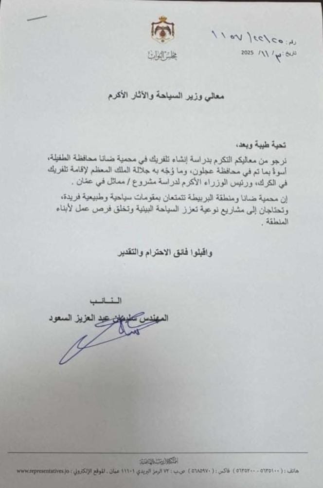 وجه النائب المهندس سليمان السعود كتابا إلى وزير السياحة والآثار يطالب فيه بدراسة إنشاء تلفريك في محمية ضانا بمحافظة الطفيلة، أسوة بما تم في محافظة عجلون.